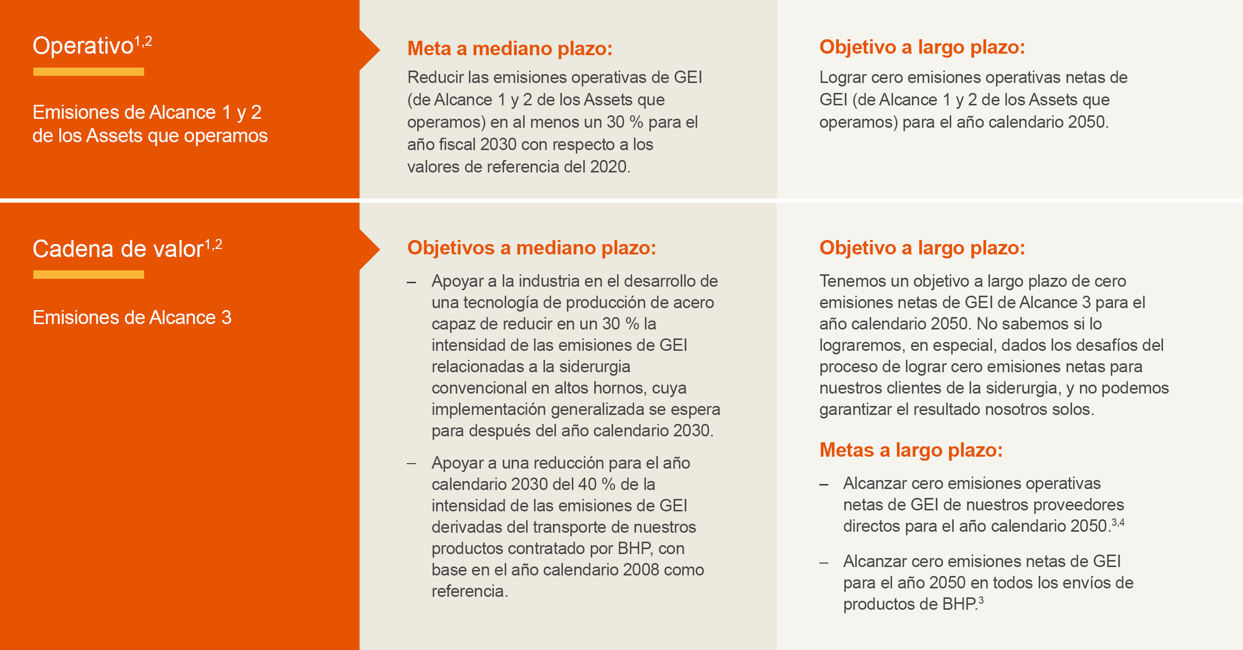 - Objetivo (según BHP respecto a las emisiones de GEI): Un resultado previsto respecto al cual hemos identificado una o más vías para obtenerlo, en función de determinados supuestos o condiciones.