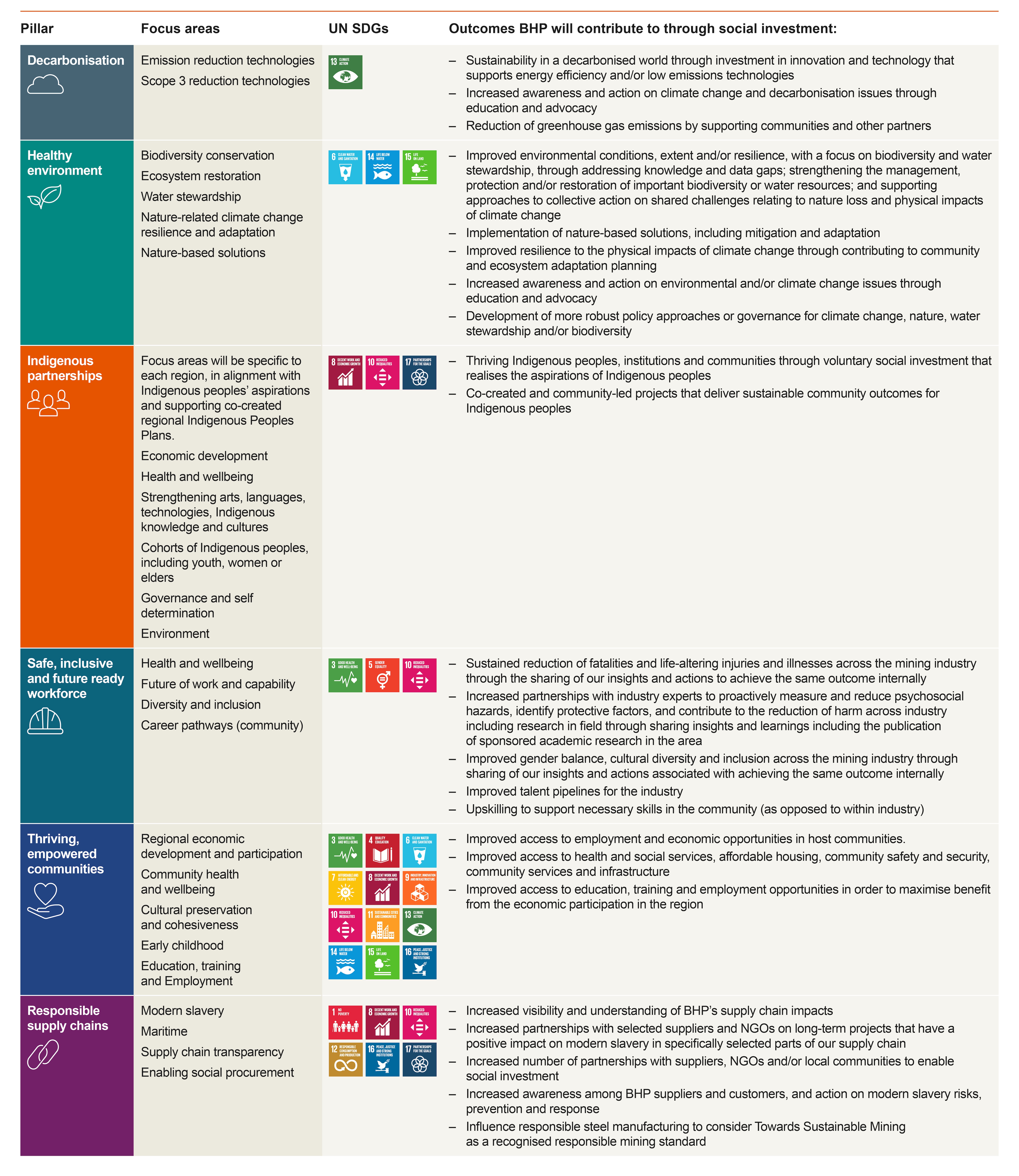 We partner with a diverse range of community groups, national and global institutes, government bodies and non-profit organisations to understand shared sustainable development challenges under our social value framework pillars and associated focus areas. Social investment focus areas to contribute towards our 2030 goals are shown in Our approach to social investment below. The progress of our social investments is monitored against the outcomes BHP will contribute to (shown below) for each of the social value framework pillars.