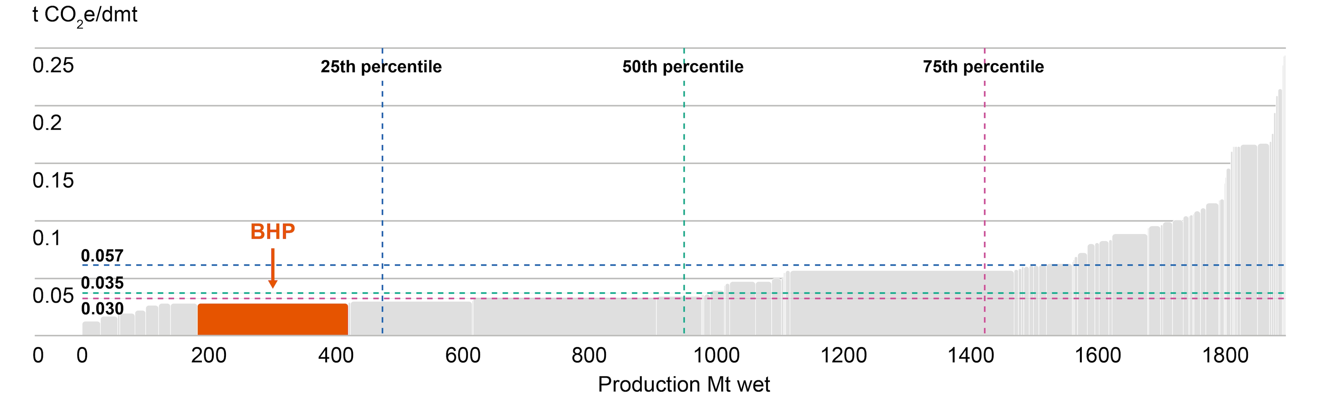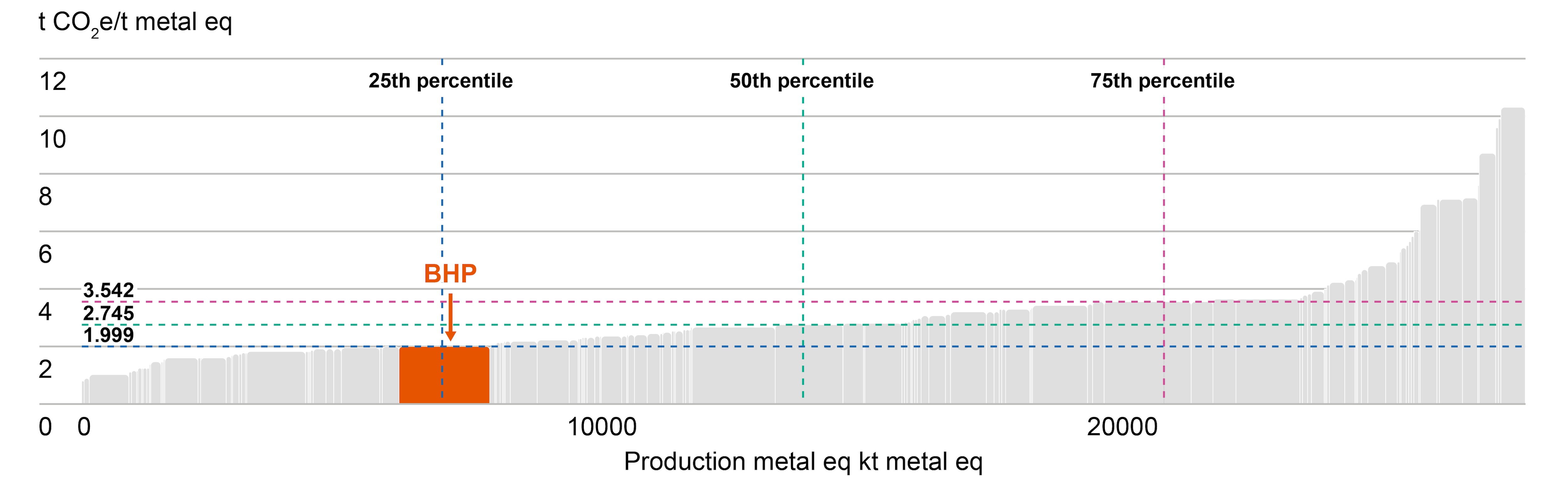 For CY2024, the GHG emissions intensity of our production of our commodities is estimated to rank in the first quartile, for our iron ore mines, and the second quartile for our copper and steelmaking coal mines of global mining operations analysed by CRU. This analysis is based on CY2024 data from CRU (as CRU data is prepared on a calendar year basis) and includes CRU’s assumptions and estimates of BHP’s operations. For more information on how GHG emissions intensity of our production of our commodities has been calculated and compared, refer to the BHP ESG Standards and Databook 2025. We have not included analysis for our nickel operations as Western Australia Nickel remains in a period of temporary suspension.