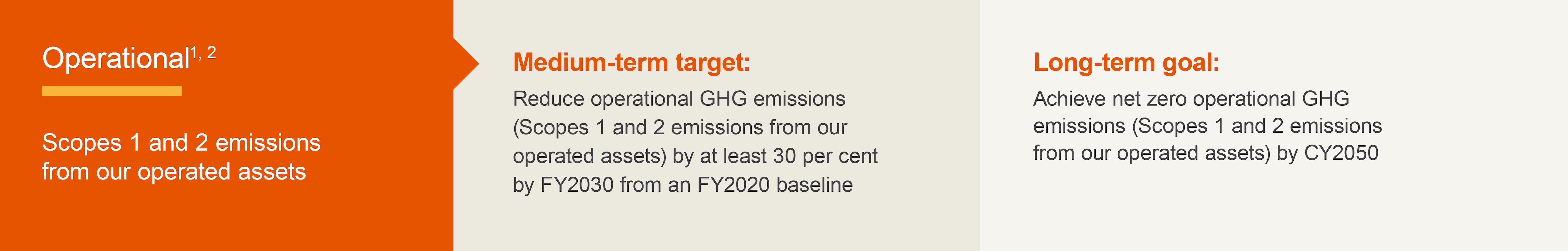 - Our operational GHG emissions medium-term target is referrable to an FY2020 baseline year and long-term goal is referrable to a FY2020 reference year. The boundary of each target and goal may, in some cases, differ from required reporting boundaries. The use of carbon credits will be governed by BHP’s approach to offsetting, available at bhp.com/climate.