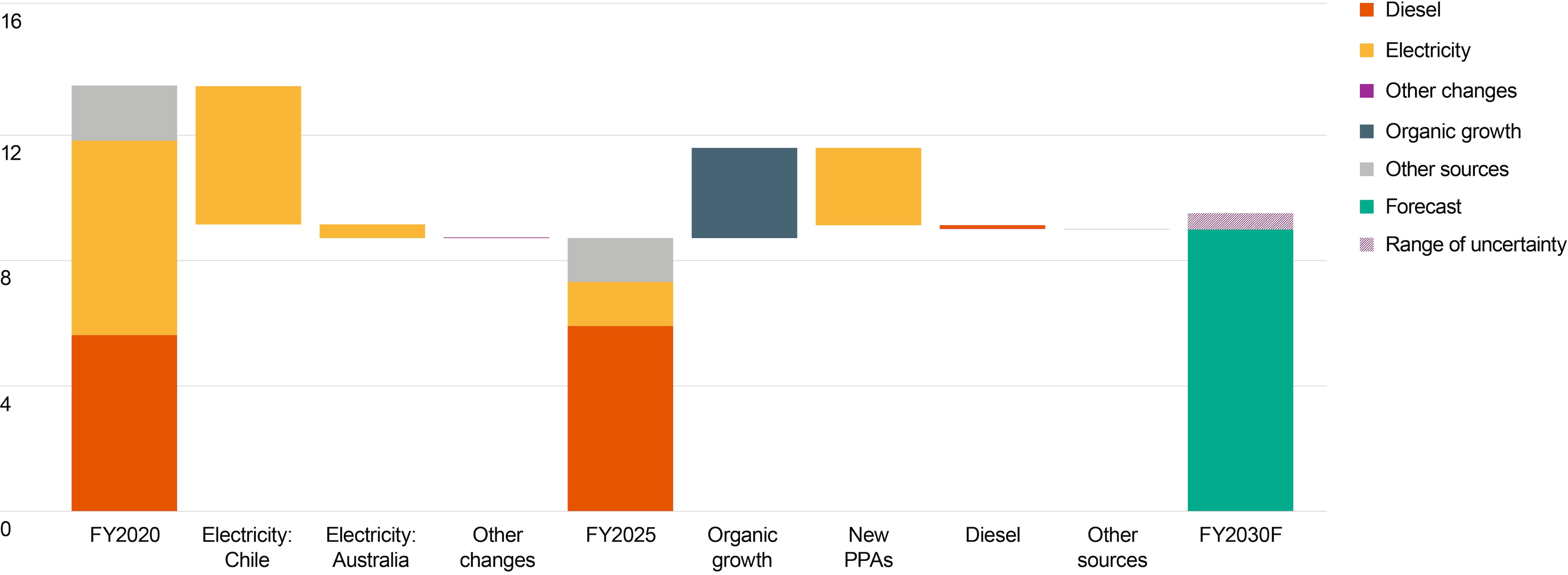 2 Future GHG emission estimates are based on current annual business plans (excluding OZ Minerals Brazil assets). FY2020 to FY2025 GHG emissions data has been adjusted for acquisitions, divestments and methodology changes. ‘Other changes’ refers to changes in GHG emissions from energy consumption other than electricity. ‘Organic growth’ represents the increase in GHG emissions associated with planned activity and growth at our operations. ‘Other sources’ refers to GHG emissions from fugitive CO2 and methane emissions, natural gas, coal and coke, fuel oil, liquefied petroleum gas or other sources. GHG emissions calculation methodology changes may affect the information presented in this chart. ‘Range of uncertainty’ refers to higher risk options currently identified that may enable faster or more substantive decarbonisation but which currently have a relatively low technology readiness level or are not yet commercially viable.