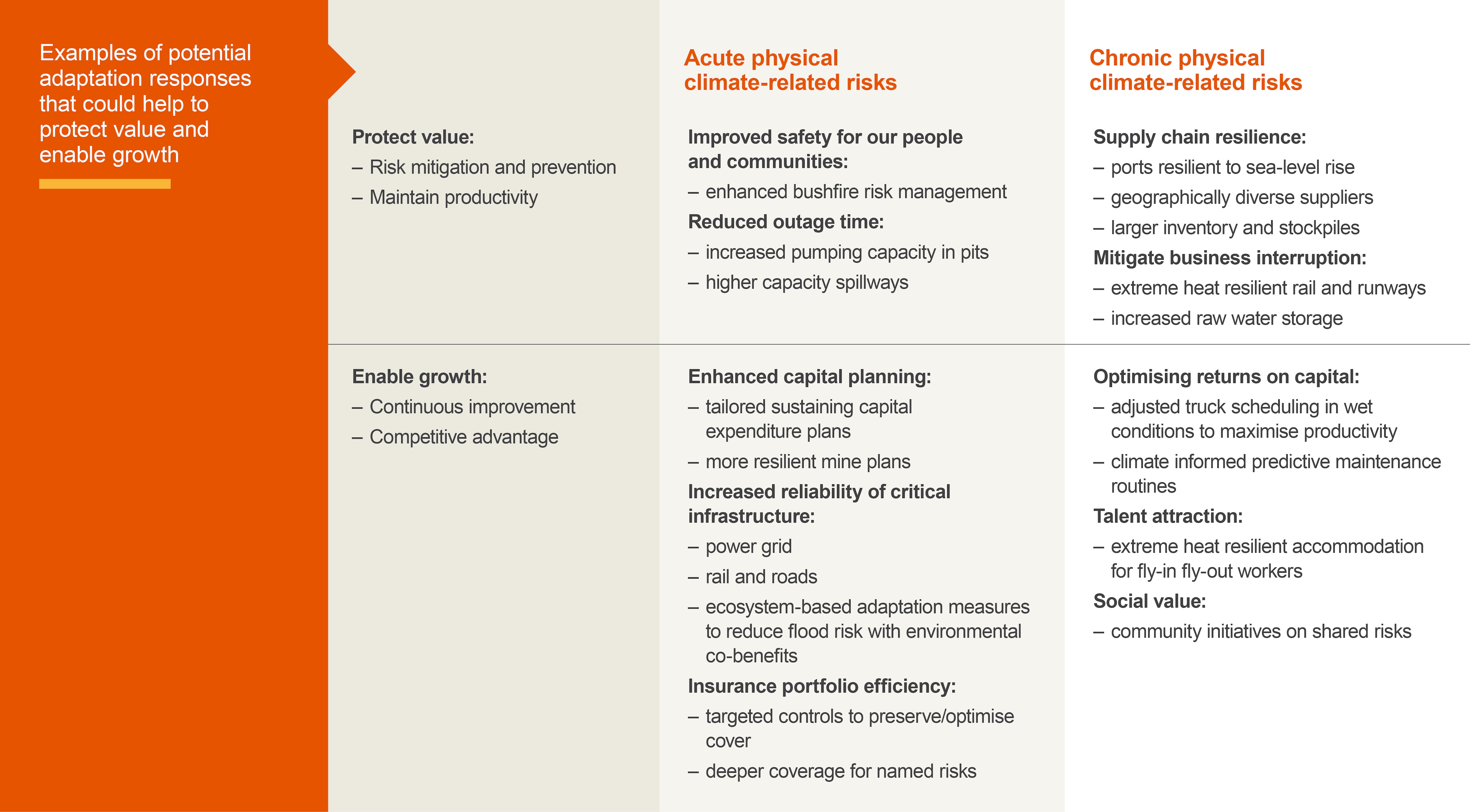 We have a range of existing controls in place for extreme weather-related risks. These include weather-related hazard detection, monitoring and associated weather preparation, emergency management plans and personnel trained in emergency response. We are committed to conforming with the Global Industry Standard on Tailings Management, including its climate-related requirements. We also employ measures to guard against potential equipment failure or inefficiencies during extreme weather. We undertake contingency planning for disruptions to our operated asset and value chain, including for scenarios caused by climate-related impacts.