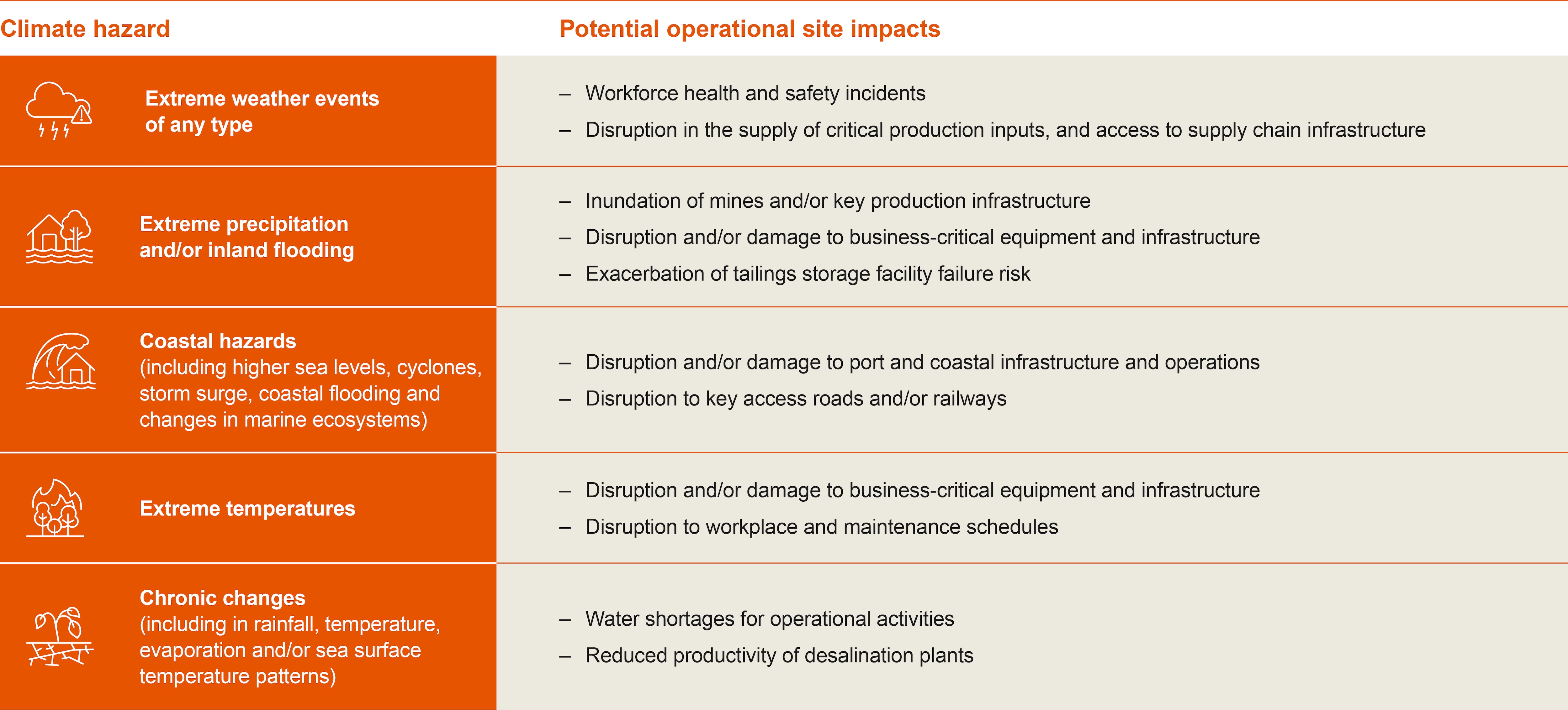The mining sector is exposed to both acute and chronic physical climate-related risks because of its remote outdoor operations with labour and physical capital exposed to the elements, and because of its dependency on global value chains. The long lives of mining assets mean they could encounter deteriorating conditions in later decades. Geographically dispersed sites and value chains increase the diversity of physical climate-related impacts we may face.