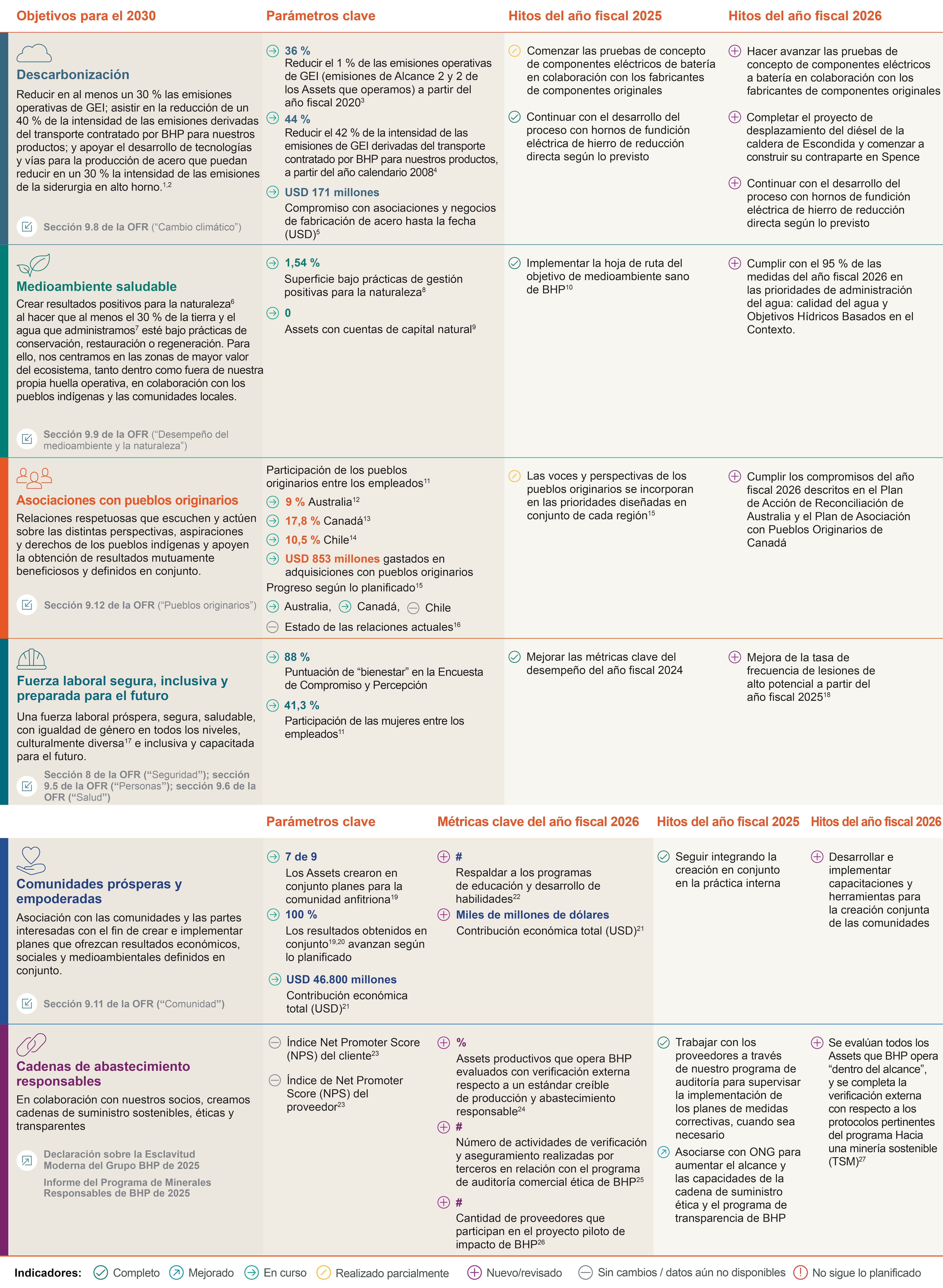 | Puede encontrar información detallada sobre nuestras metas y avances de 2030 aquí: | Sección de la Revisión Operativa y Financiera del Informe Anual de BHP de 2025 | Localización de páginas web sobre temas relacionados |