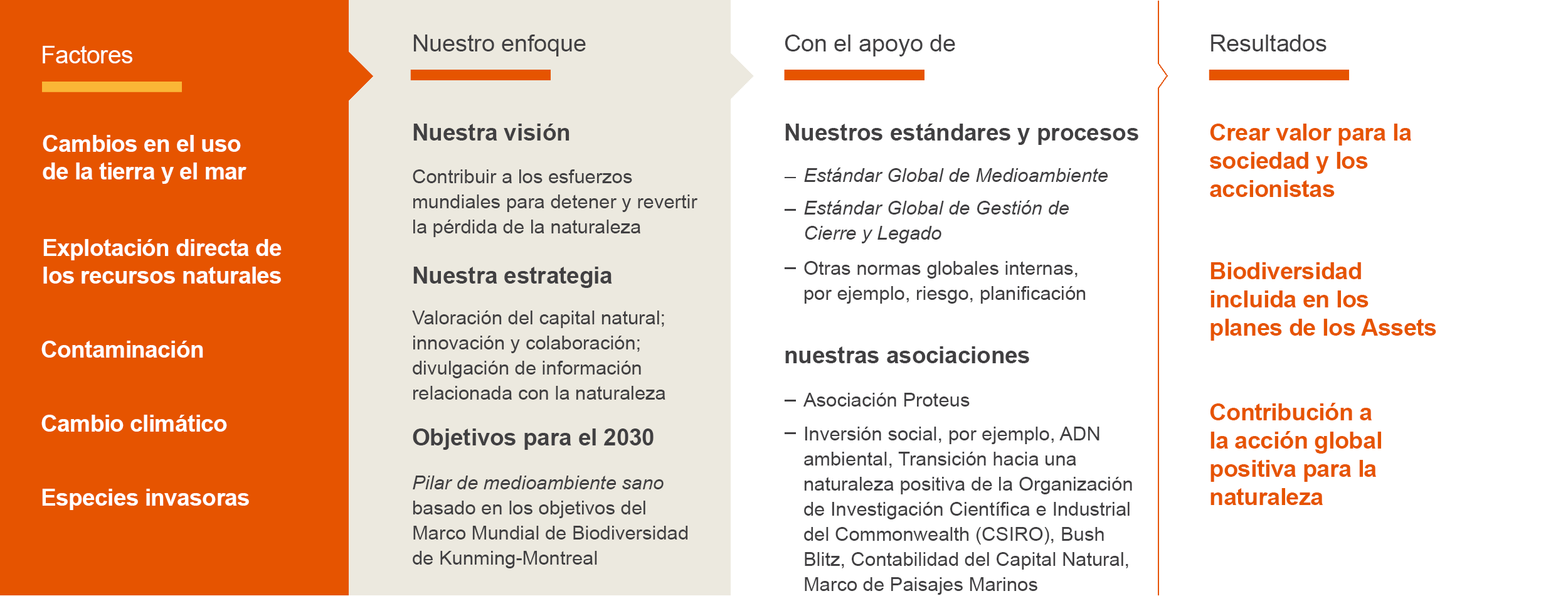 BHP ha elaborado una estrategia de biodiversidad para todo el Grupo (desarrollada a continuación) que describe nuestro propósito y nuestras prioridades estratégicas y que está diseñada para ayudar en la toma de decisiones operativas a lo largo de todo el ciclo de vida de las operaciones mineras en los Assets que operamos. Esta estrategia proporciona una orientación clara que permite alinear los objetivos de biodiversidad y tierra de los Assets y ayuda a cumplir el objetivo de medioambiente sano para 2030.