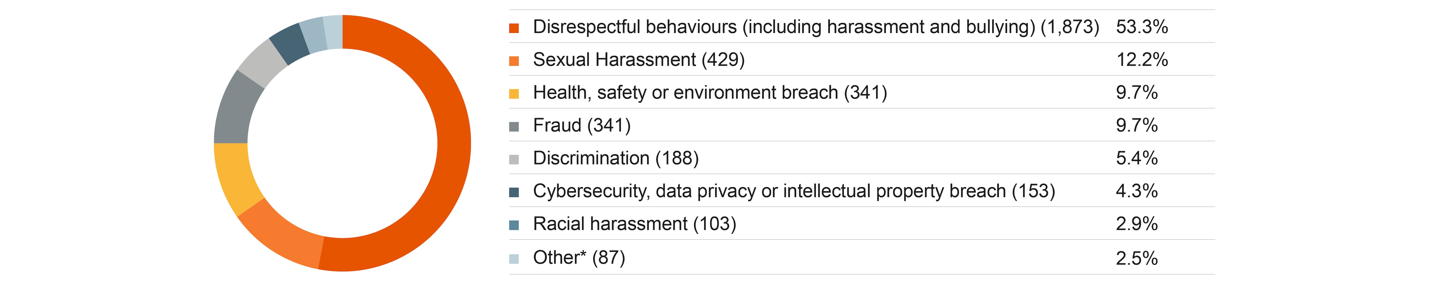*Other: This includes issues such as Retaliation for speaking up; Consensual relationship with power imbalance; Failure to report Code of Conduct Breach; Attempting to identify an anonymous reporter; Improper political or governmental conduct; Trade control breach; Inappropriate investigator conduct in business conduct investigation.