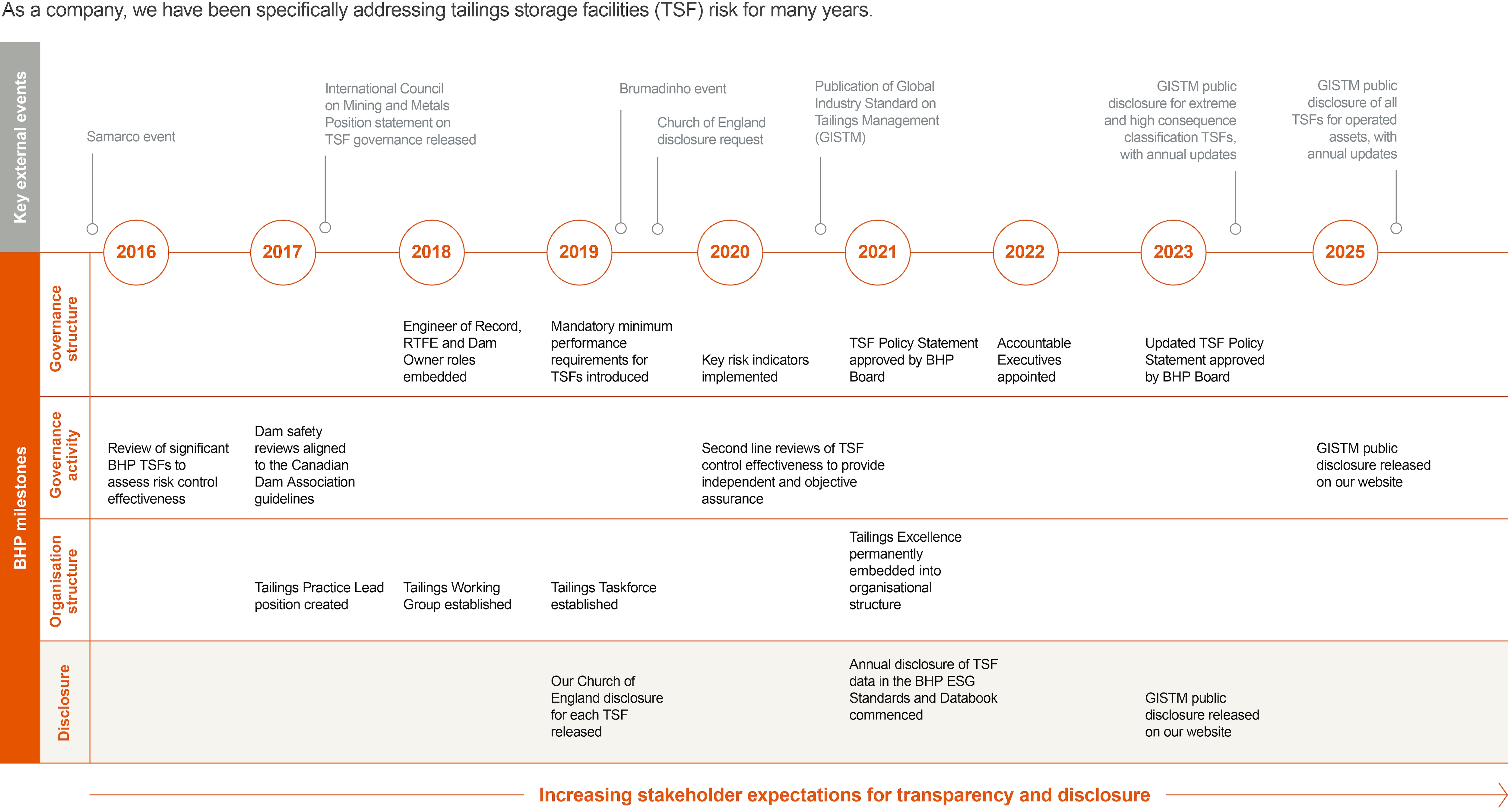 Following the tragic TSF failures at Fundão dam at Samarco in 2015 (a non-operated joint venture (NOJV) owned 50 per cent by BHP) and Brumadinho dam at Vale’s iron ore operation in Brazil in 2019, we continue to evolve our approach to TSF management, with a focus on the governance and conformance with industry standards, and the delivery of a continuous reduction in TSF failure risk.