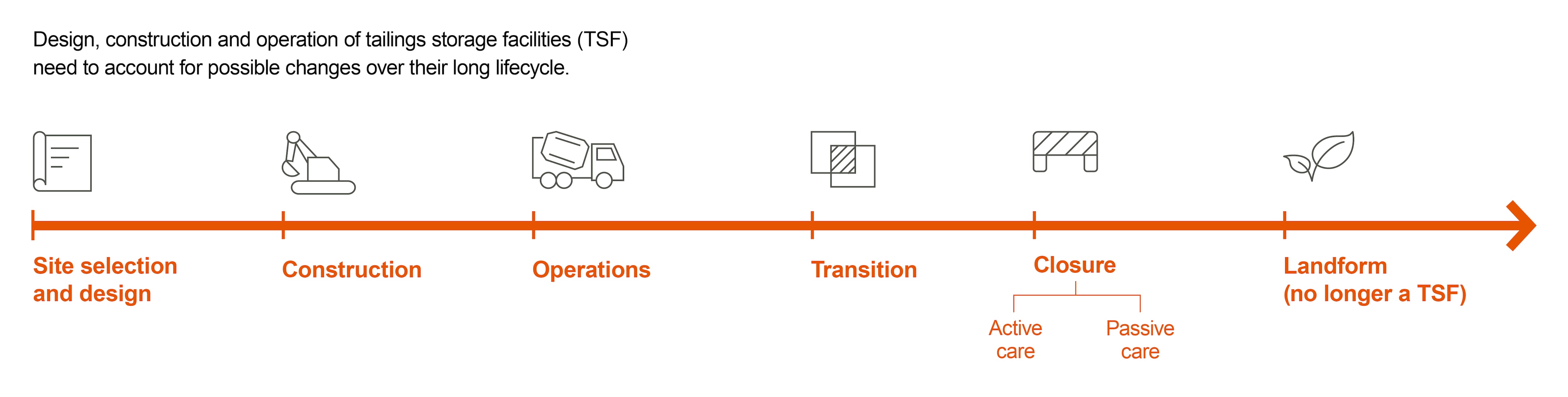 TSFs evolve over their lifecycle, from planning, design, construction, operations, closure and ultimately to post closure. There may also be periods of care and maintenance between operational phases.