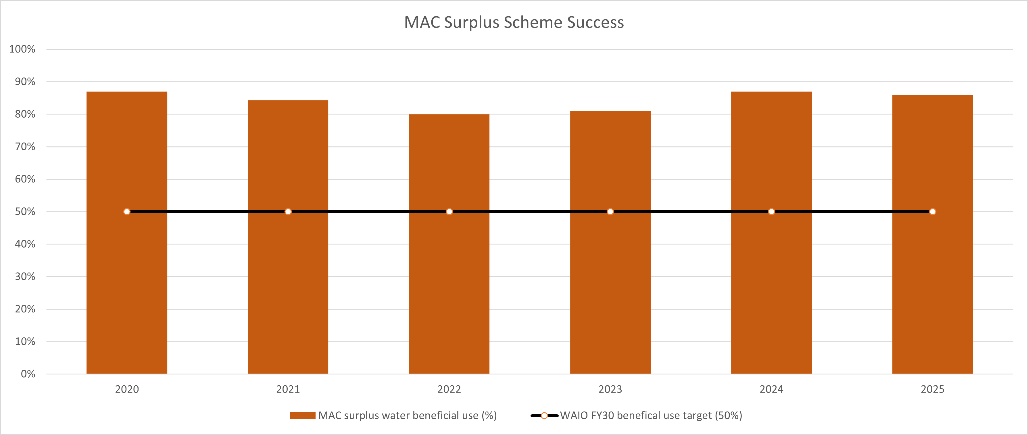 En función del diseño y la capacidad de estos planes de excedente, MAC pudo devolver el 86 % (16,7 ML/d o 193 L/s) del excedente de agua del año fiscal 2025 a los acuíferos regionales para compensar la reducción potencial (Figura 3) y preservar el agua para futuros usos beneficiosos (por ejemplo, la recarga gestionada de acuíferos de Juna Downs, que contribuye a la recuperación de las aguas subterráneas compensando la reducción en la región de Coondewanna Flats).