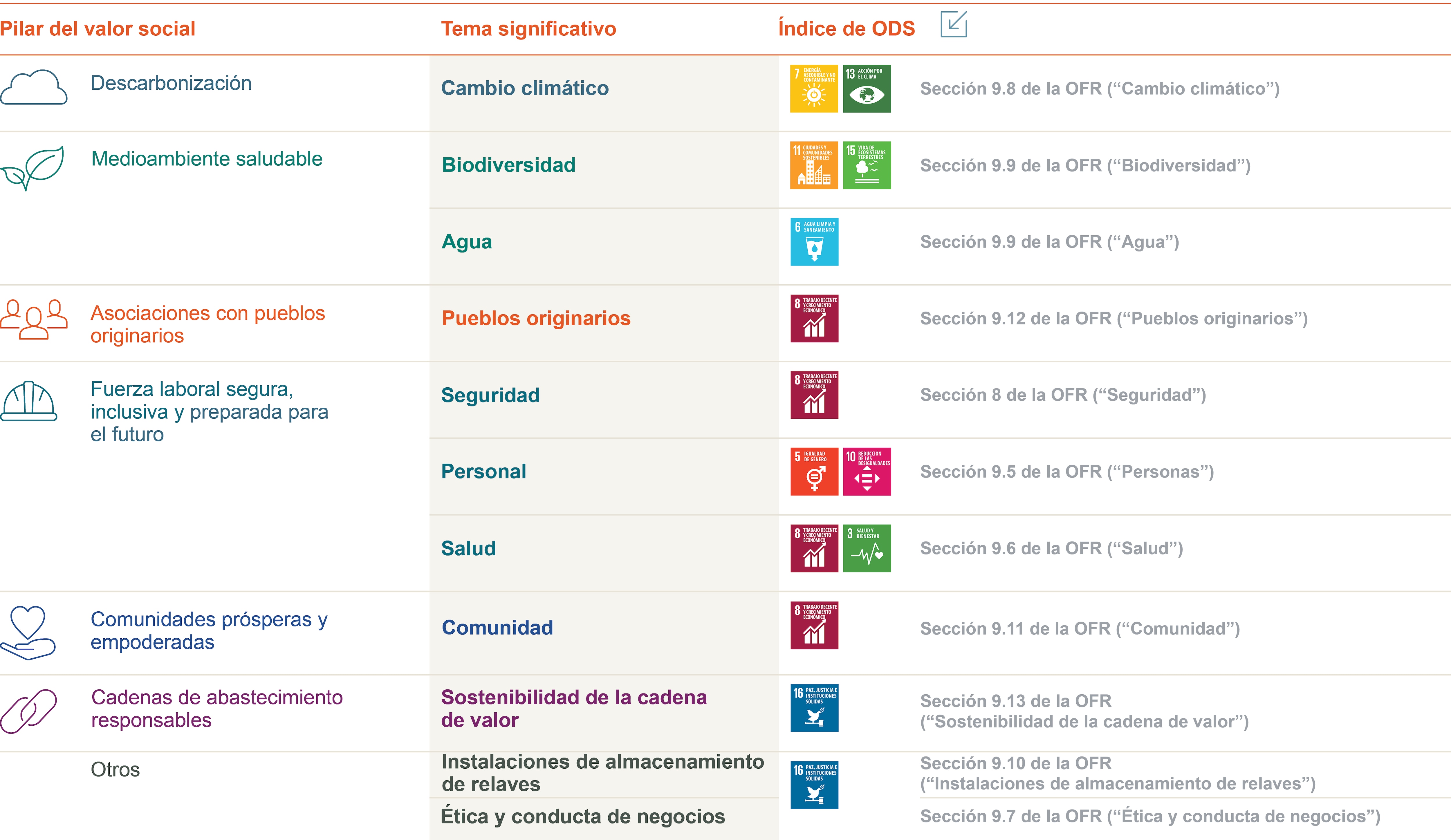 Los temas materiales de sostenibilidad que se muestran en el siguiente cuadro son las áreas de interés de nuestras divulgaciones de sostenibilidad en la Revisión Operativa y Financiera, sección 9 (“Sostenibilidad”), del Informe Anual de BHP de 2025. Consulte la sección de referencias en el siguiente cuadro para saber dónde se tratan nuestros temas materiales de sostenibilidad en la Revisión Operativa y Financiera del Informe Anual de BHP de 2025.