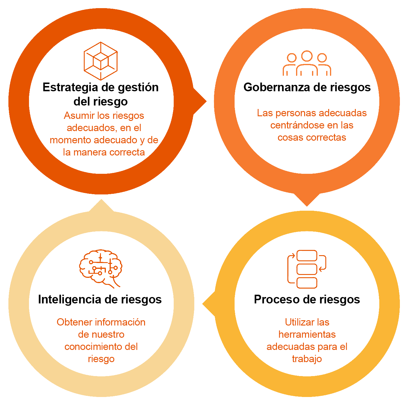 Nuestro Marco de Riesgos tiene cuatro pilares: estrategia de riesgos, gobernanza de riesgos, proceso de riesgos e inteligencia del riesgo.