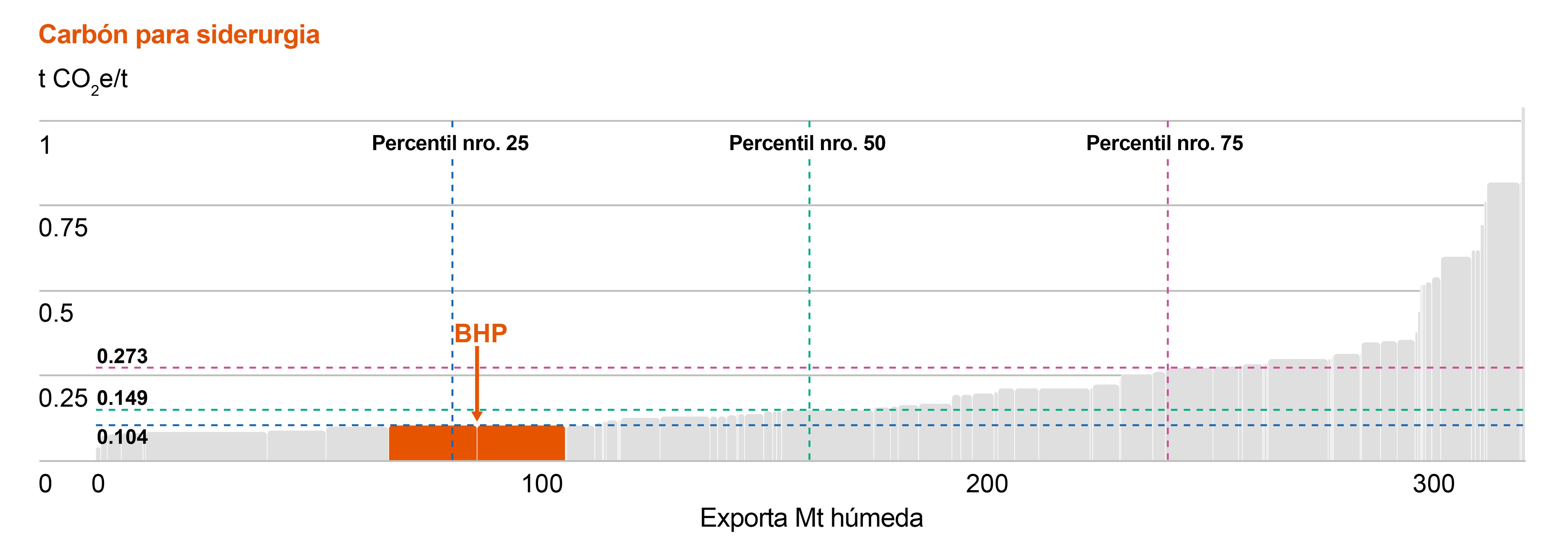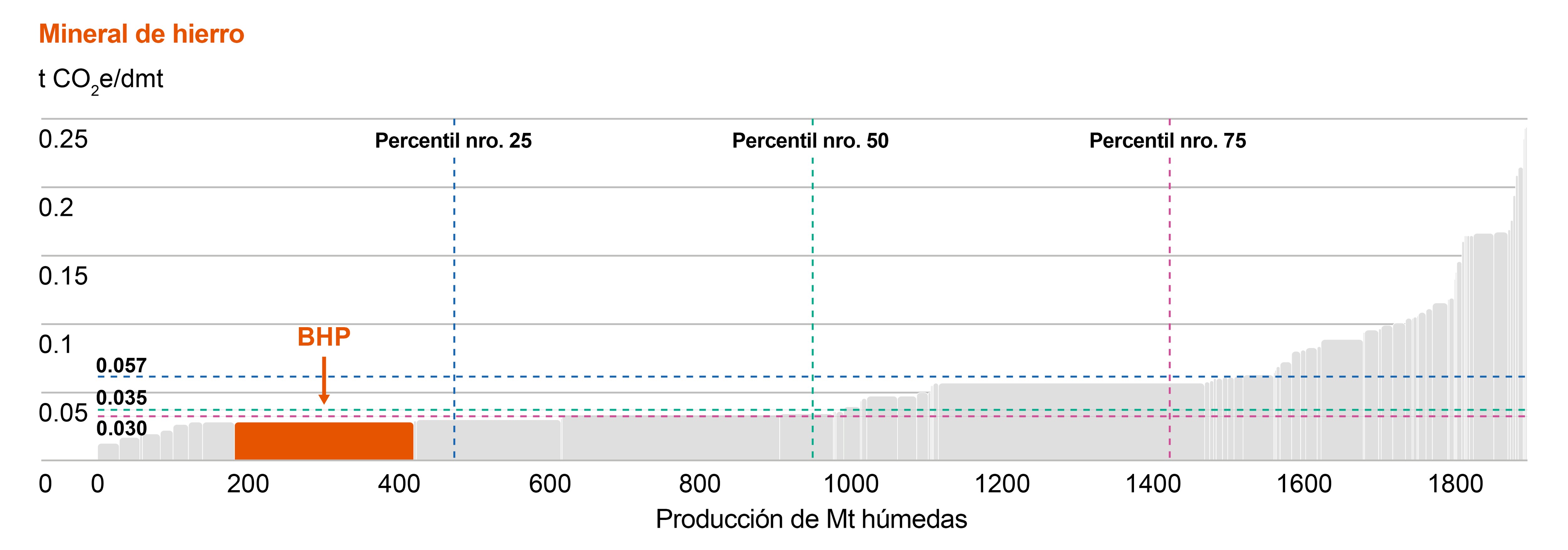 En cuanto al año calendario 2024, se prevé que la intensidad del GEI que emite nuestra producción de materias primas en las minas de mineral de hierro se ubicará en el primer cuartil entre las operaciones mineras a nivel mundial analizadas por CRU, y las operaciones de cobre y de carbón para minería en el segundo. Este análisis se basa en los datos del año calendario 2024 de CRU (ya que los datos de CRU se preparan con base en un año calendario), e incluye las hipótesis y estimaciones de CRU para las operaciones de BHP. Para más información sobre cómo se ha calculado y comparado la intensidad de las emisiones de GEI por la producción de materias primas, consulte los Estándares y el Libro de datos de ESG de BHP de 2025. No hemos incluido el análisis de nuestras operaciones de níquel, ya que Western Australia Nickel está en un período de suspensión temporal.