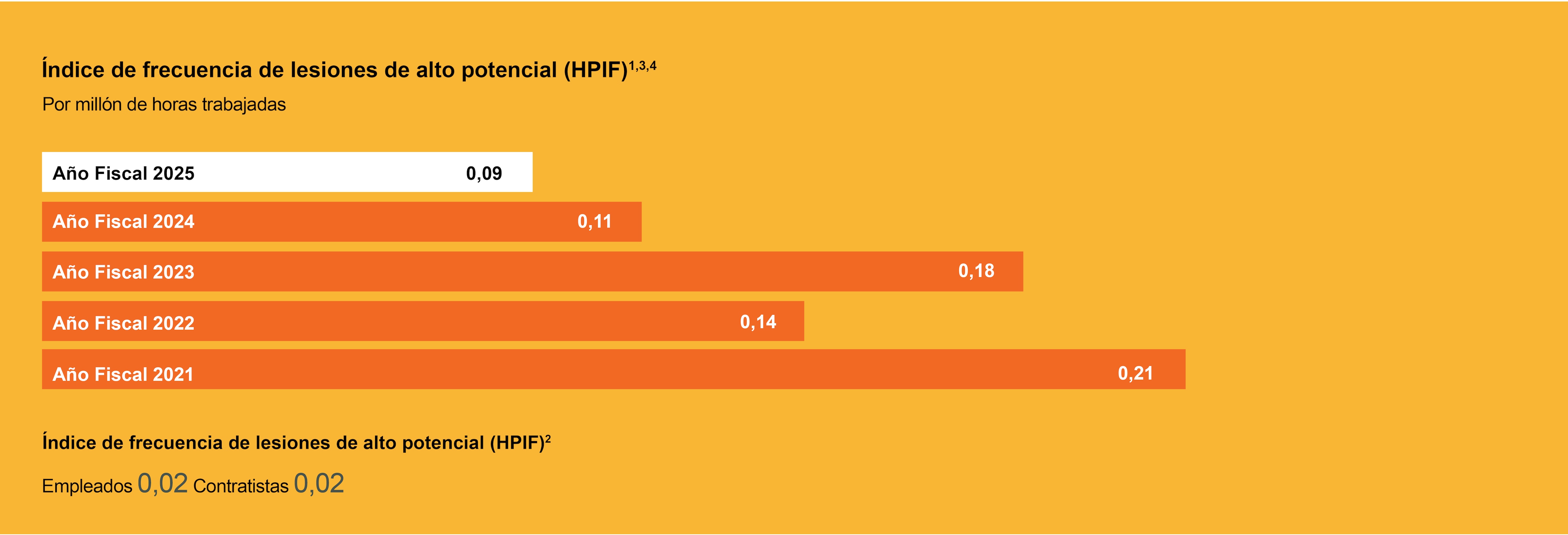 - una reducción del 18 % en la tasa de lesiones de alto potencial por millón de horas trabajadas (HPIF), en comparación con el año fiscal 2024, con más riesgos relacionados con la caída de objetos. En el año fiscal 2024, el riesgo más alto estaba relacionado con componentes vehiculares y equipos móviles;