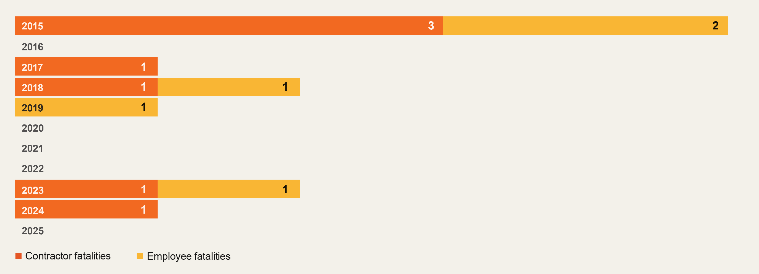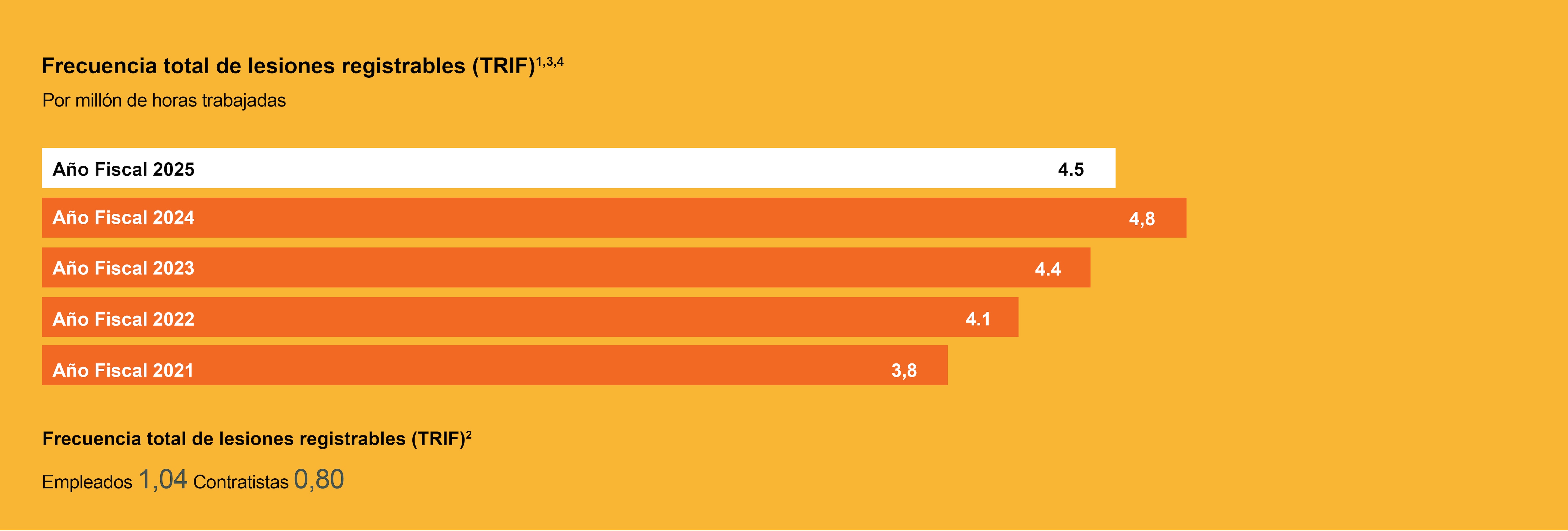 - una reducción del 7 % en la tasa de lesiones registrables totales por millón de horas trabajadas (TRIF) en comparación con el año fiscal 2024. La mayoría de las lesiones registrables estuvo relacionada con resbalones, tropiezos y caídas, y a estas le siguieron las lesiones por atrapamiento entre objetos, tanto de empleados como de contratistas;